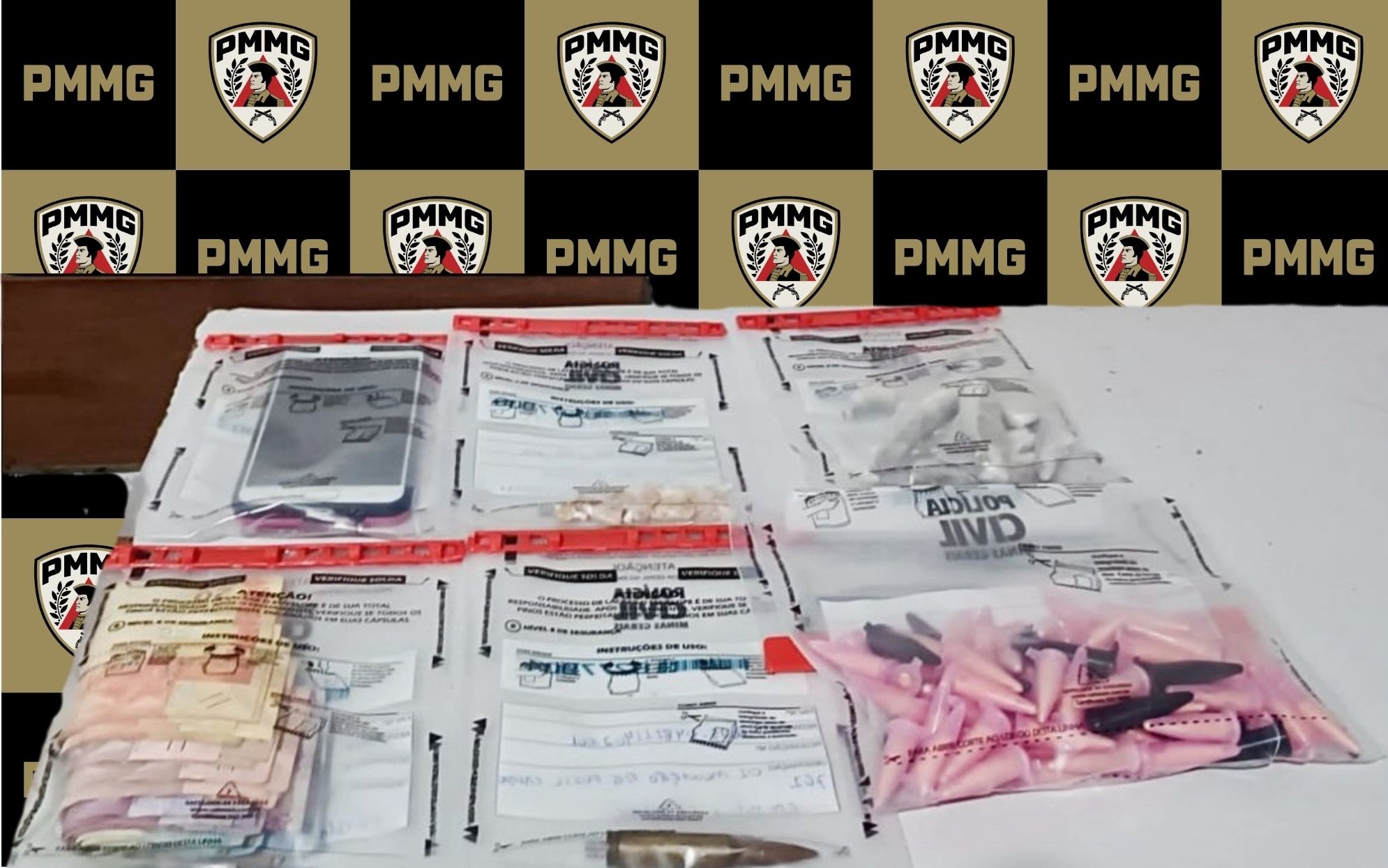 Durante as buscas, foram apreendidos 71 pinos de cocaína, 13 pedras de crack, 10 buchas de maconha, um cartucho calibre 7,62, um celular e dinheiro em espécie, todos escondidos no quarto do investigado.