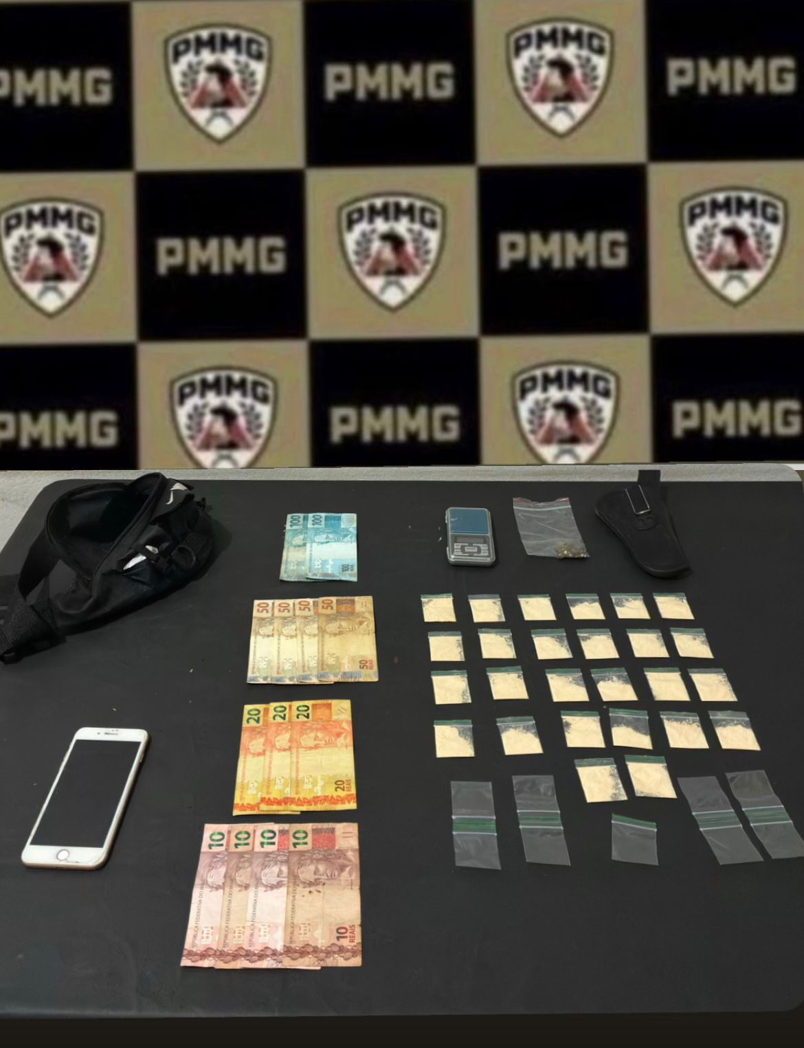 • Dinheiro, materiais para dolagem, balança de precisão e eletrônicos apreendidos.